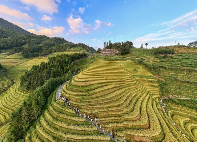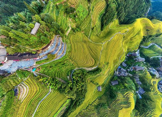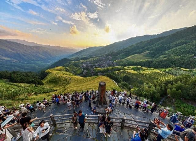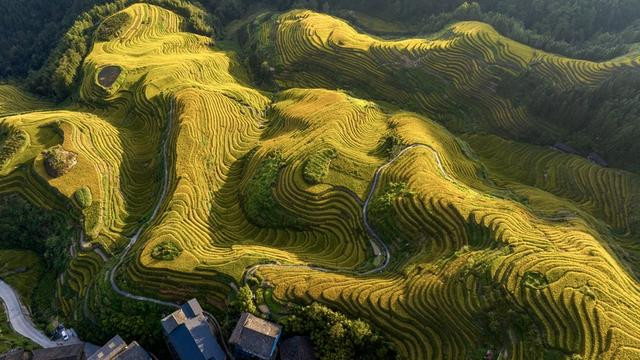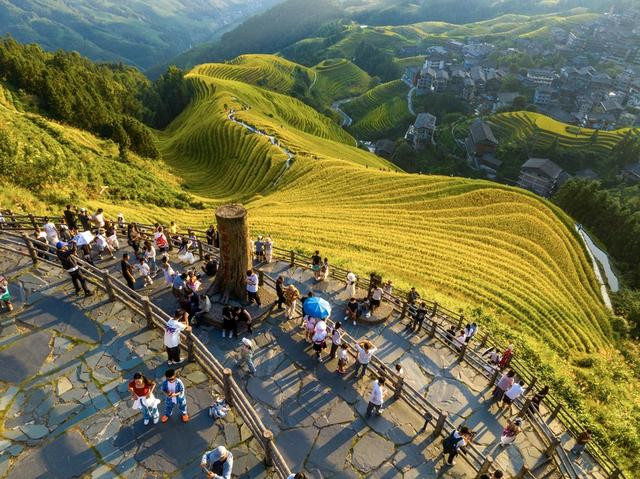 2025年10月2日,广西桂林市龙胜各族自治县龙脊镇平安村,梯田层层叠叠,金黄的稻穗在秋风中摇曳,迎来一年中最美的丰收季,绘出一幅绚烂多彩的田园丰收画卷。吸引众多游客慕名前来观光游玩、拍照打卡,畅享假日生活。(未经授权,请勿转载)